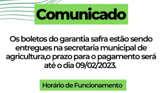 A Prefeitura de Vista Serrana, através da Secretaria de Agricultura, informa que os boletos do Garantia-Safra 2022/2023 já estão disponíveis para retirada.