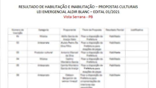 A Prefeitura de Vista Serrana publicou na sexta-feira (19), o resultado de habilitação e inabilitação das propostas cadastradas por artistas locais, através do Edital nº 001/2021 da Lei Aldir Blanc.