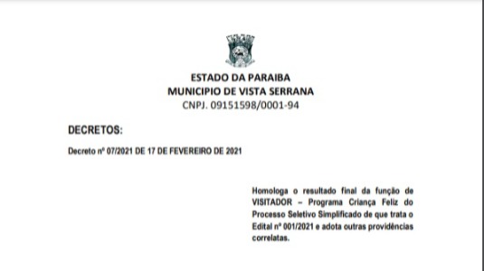 O Município de Vista Serrana publicou o Decreto nº 007/2021 e homologou o resultado final do Processo Seletivo Simplificado (PSS) para o preenchimento de vaga para função de visitador no Programa Criança Feliz.