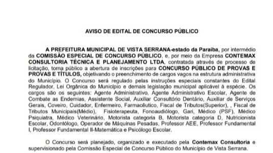 A Prefeitura de Vista Serrana publicou nesta terça-feira (22) o Aviso de Edital para realização de Concurso Público para o preenchimento de vagas na administração.Conforme o documento, o período de inscrições está fixado entre 28 de dezembro desse ano até o dia 3 de fevereiro de 2021. A empresa responsável pelo certame será a Contemax Consultoria.