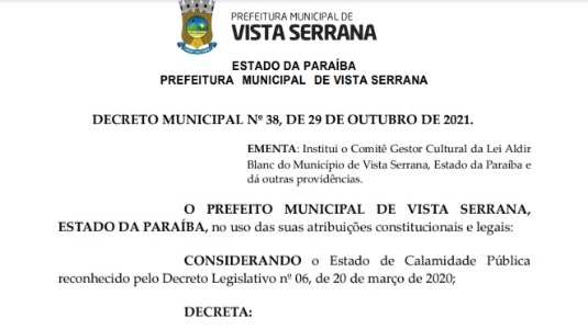 A Prefeitura de Vista Serrana publicou o Decreto nº 038/2021 que institui o Comitê Gestor Cultural da Lei Aldir Blanc do Município.