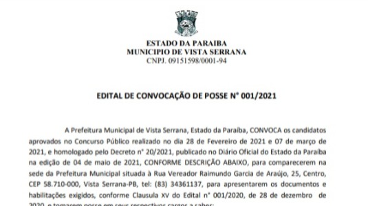 A Prefeitura de Vista Serrana publicou nesta segunda-feira (24) o Edital nº 001/2021 de convocação de posse para os candidatos aprovados no último Concurso Público promovido pelo Município.Conforme o documento, os aprovados devem comparecer na sede da Prefeitura Municipal, localizada na Rua Vereador Raimundo Garcia de Araújo, nº 25, no Centro.